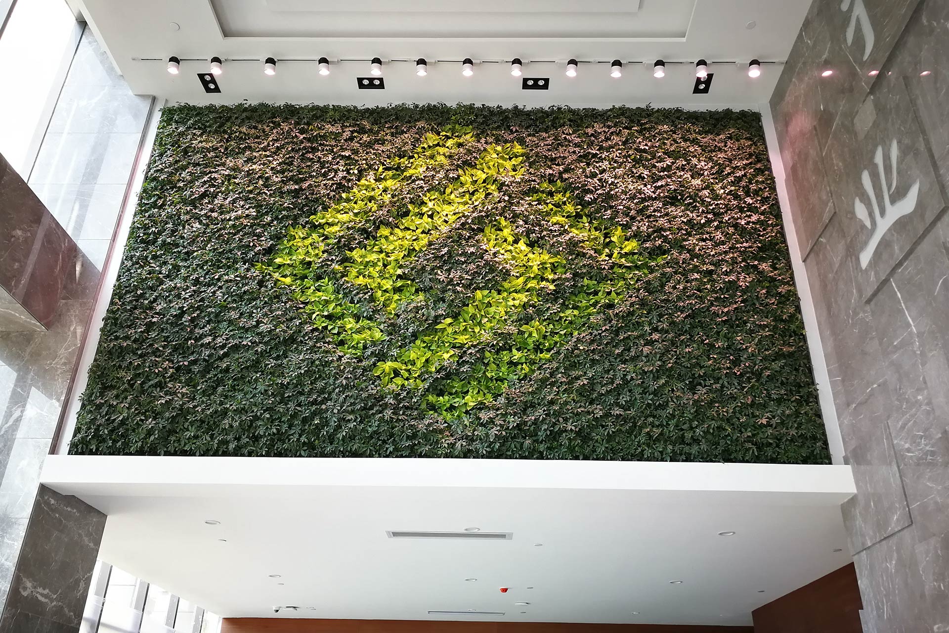 垂直绿化项目设计之一,在平缓的立面上用不同的植物组合形成不同的图形和图案,增添立体设计的效果。